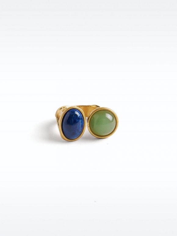 Anillo abierto con detalle de piedras ovaladas y redondas. Acabado dorado.