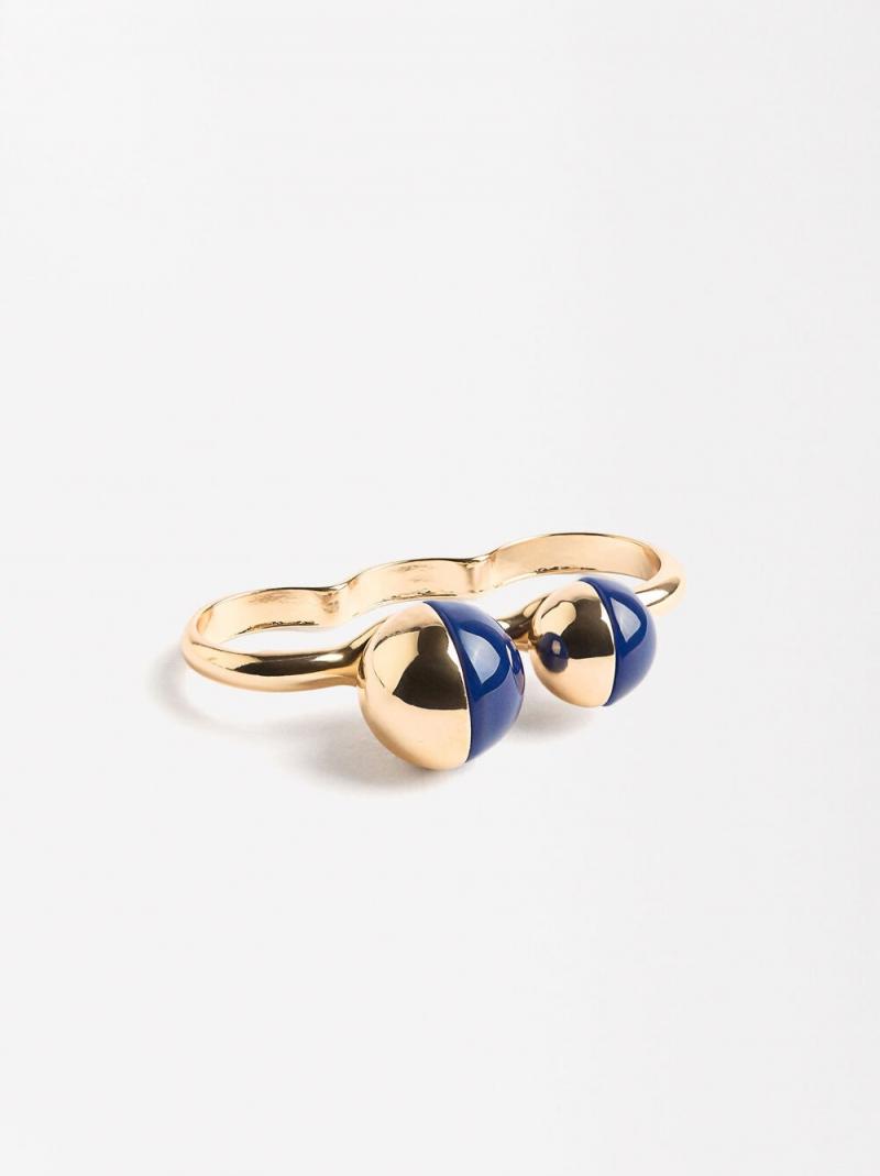 Anillo para tres dedos. Detalle de medias esferas con una mitad en resina. Acabado dorado.