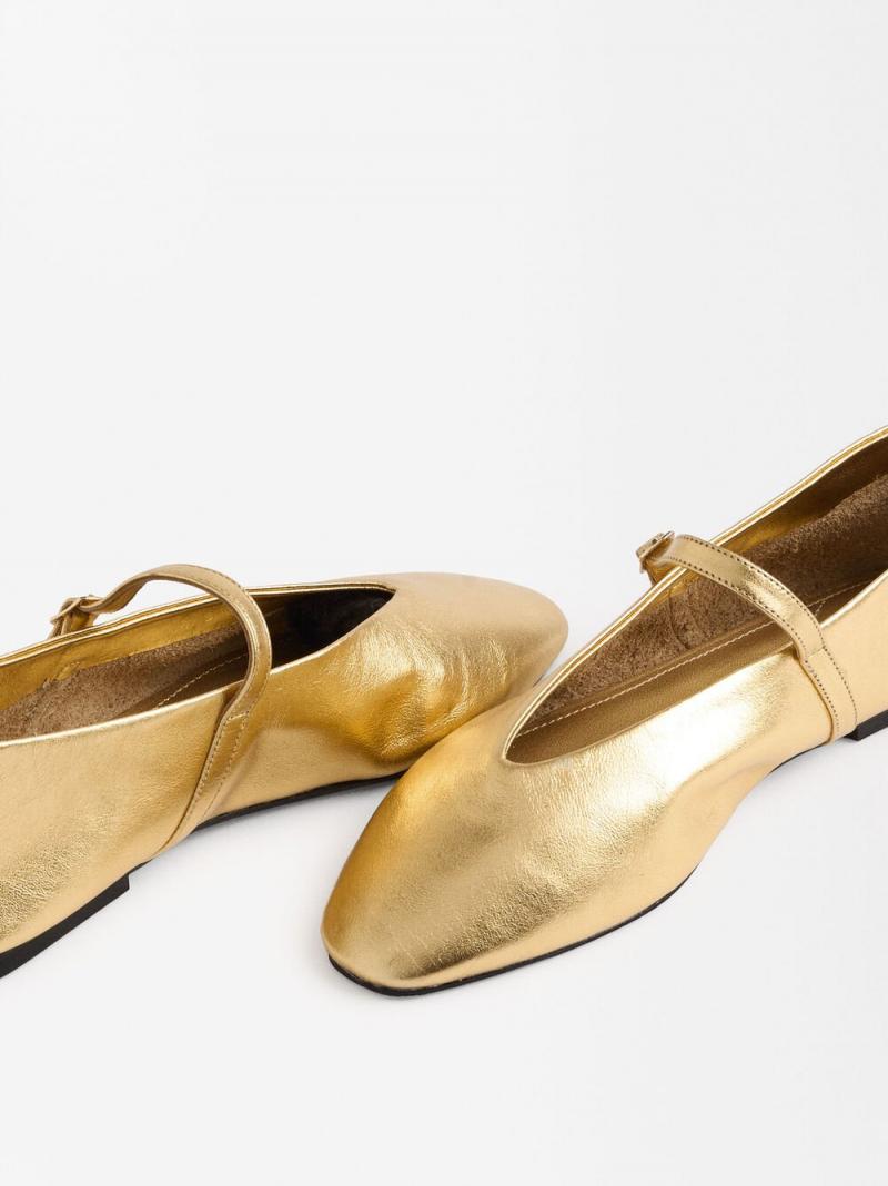 Bailarinas de piel metalizada. Tira en el empeine con hebilla. Punta ovalada. Suela de goma. Plantilla acolchada para mayor comodidad.