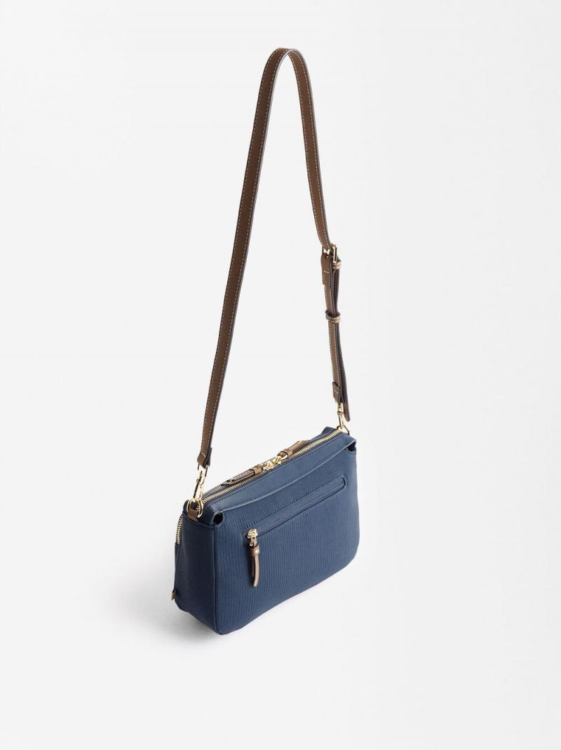 Bolso bandolera básico con textura canalada. Forro y bolsillo interior. Bolsillo exterior, frontal y posterior. Aberturas con cierre de cremallera. Asa ajustable y removible.