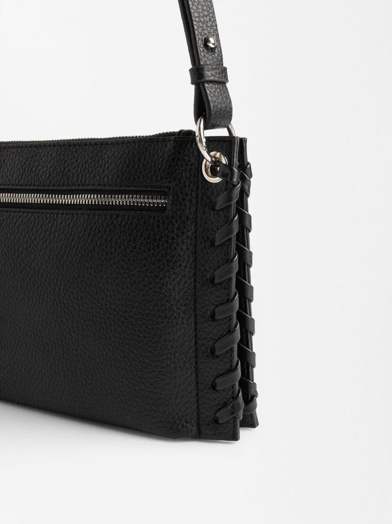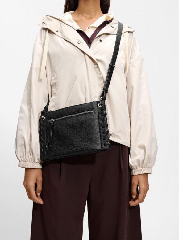 Bolso bandolera con textura y bolsillo exterior. Bordes con detalle trenzado. Cierre de cremallera. Forro y bolsillo interior. Asa ajustable y removible.