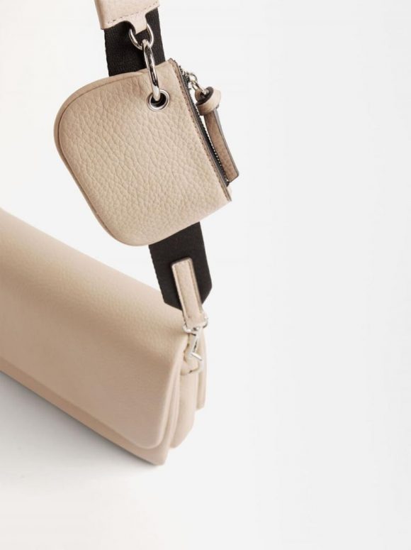 Bolso bandolera con textura. Cierre de solapa con imán. Tres compartimentos interiores, uno con cremallera. Forro y bolsillo interior. Bolsillo exterior en la parte posterior. Asa ajustable y removible. Incluye asa de hombro. Colgante removible.
