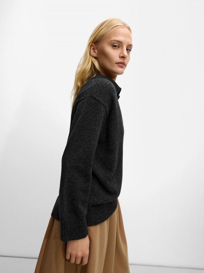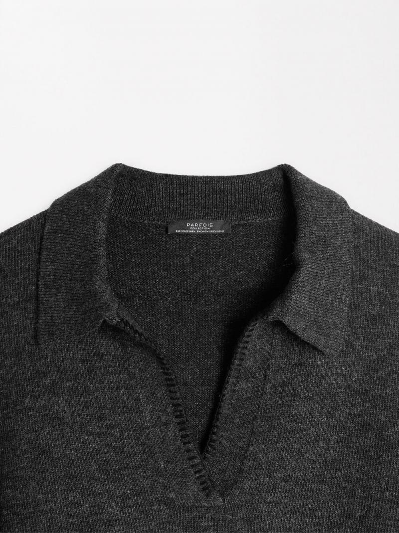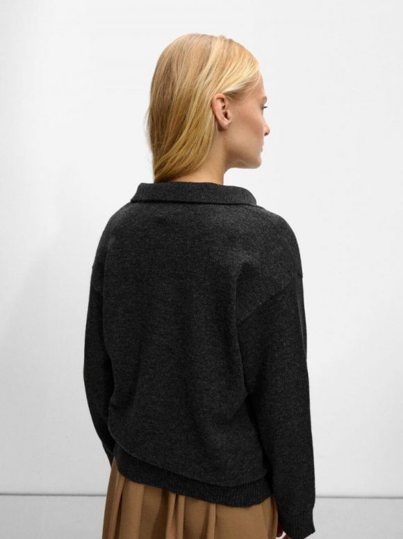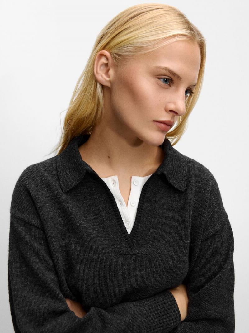 Jersey de punto con lana y escote en V. Cuello polo. Manga larga. La modelo mide 1,72 m y lleva la talla XS-S.