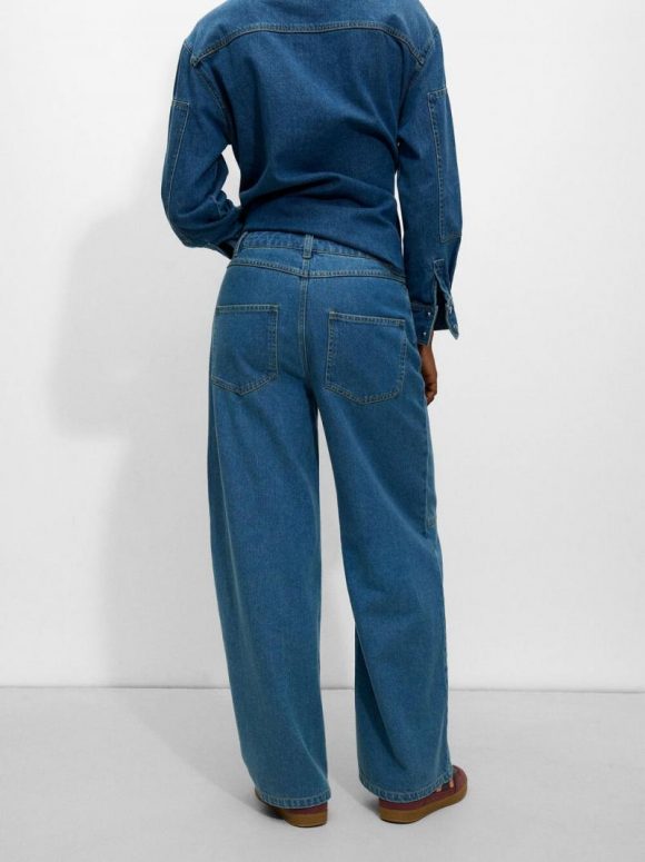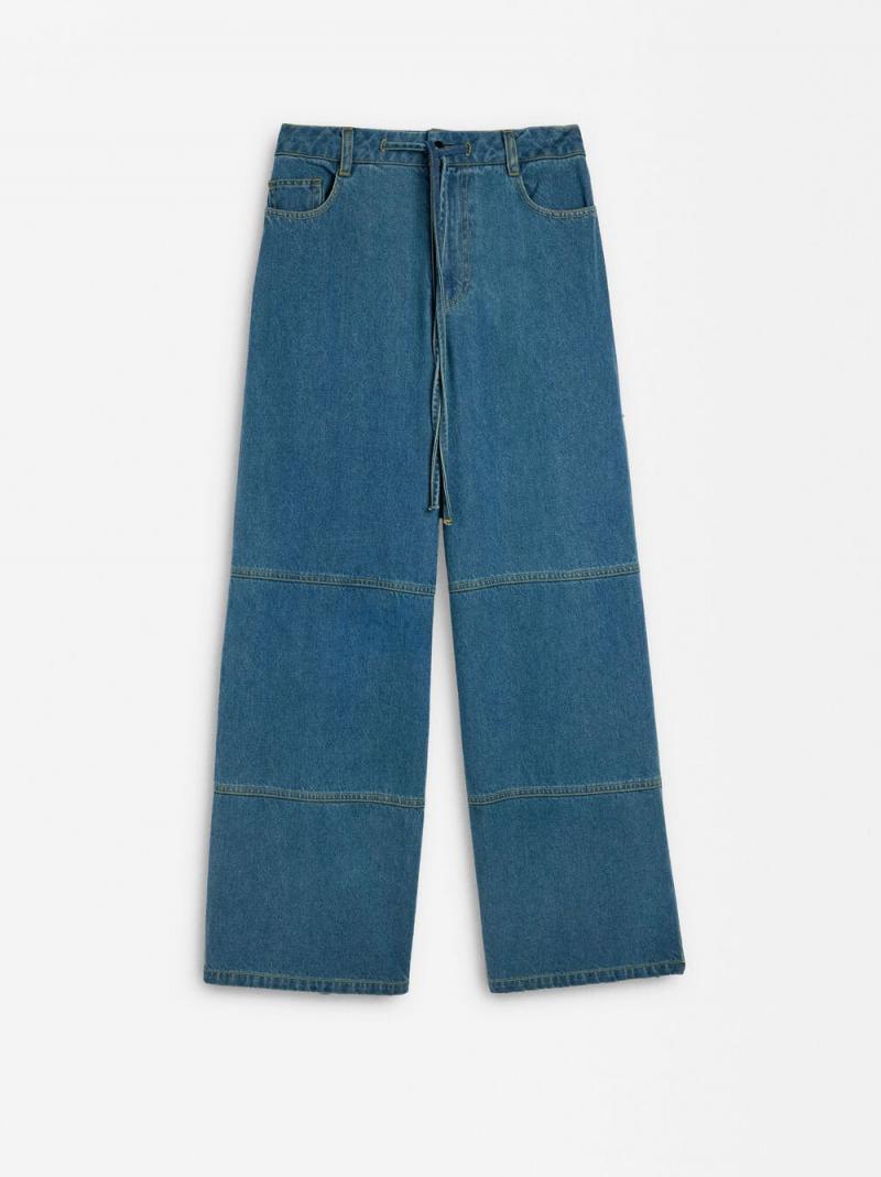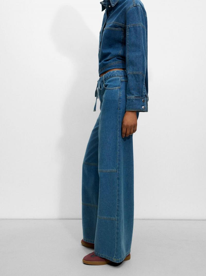 Pantalones denim wide leg con detalle de costura. Cintura con cordón ajustable. Cierre con botón y cremallera. Bolsillos laterales y traseros. La modelo mide 1,78 m y lleva la talla 36.