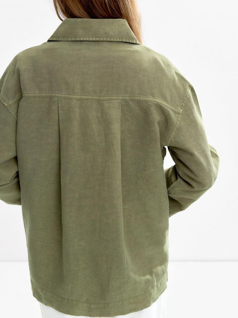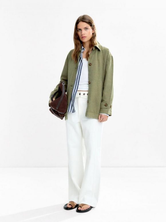 Chaqueta con lino y bolsillos laterales. Cuello de solapa. Manga larga con botones en los puños. Abertura con botones. La modelo mide 1,76 m y lleva la talla XS-S.
