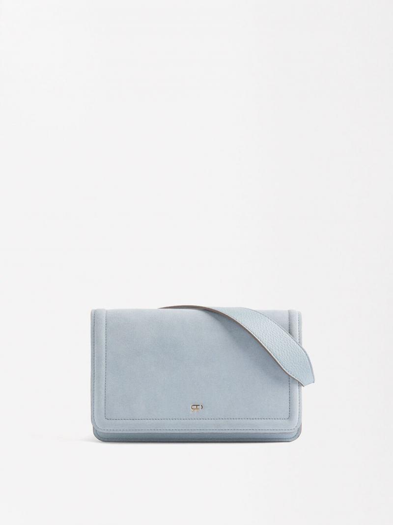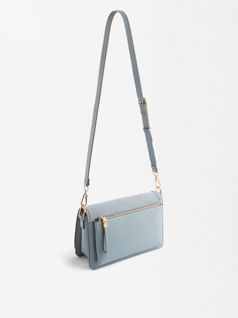 Bolso de hombro con piel con cierre de solapa con imán. Forro y bolsillo interior. Bolsillo exterior trasero con cierre de cremallera. Asa de hombro extraíble. Asa bandolera ajustable y extraíble.