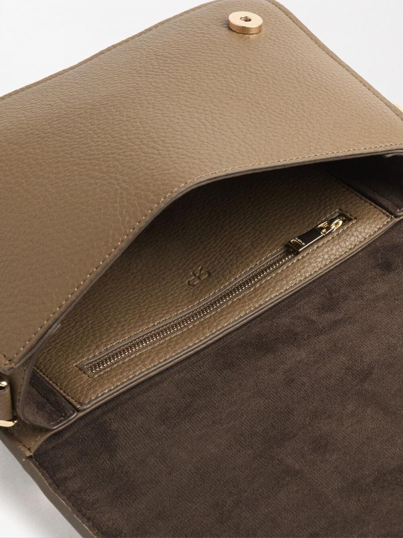 Bolso de hombro con piel con cierre de solapa con imán. Forro y bolsillo interior. Bolsillo exterior trasero con cierre de cremallera. Asa de hombro extraíble. Asa bandolera ajustable y extraíble.