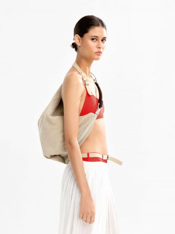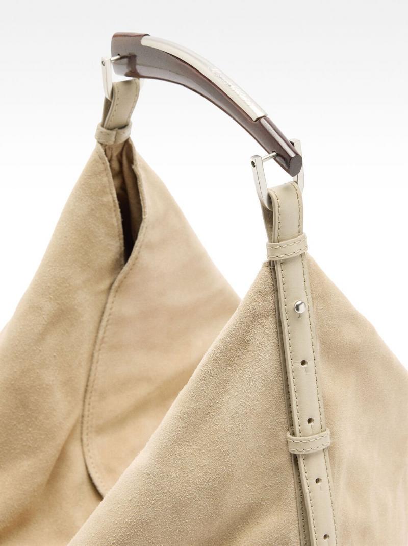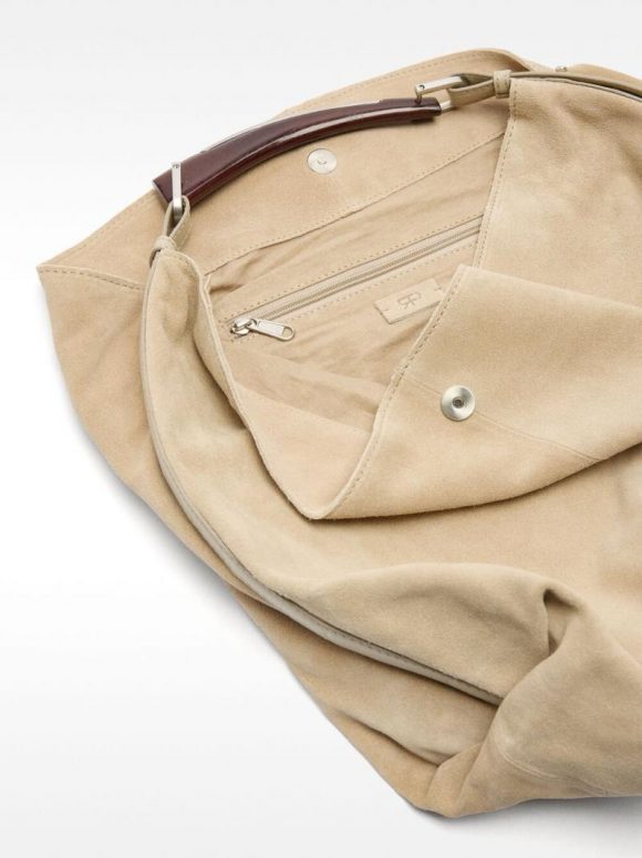 Bolso de hombro de piel ante. Tipo hobo. Forro y bolsillo interior. Cierre de imán con solapa. Asa rígida fija y ajustable.