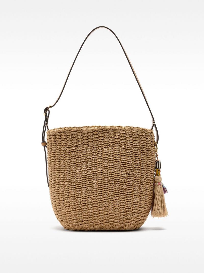 Bolso tipo bucket con efecto rafia. Forro y bolsillo interior. Asa de hombro fija y ajustable. Colgante removible.