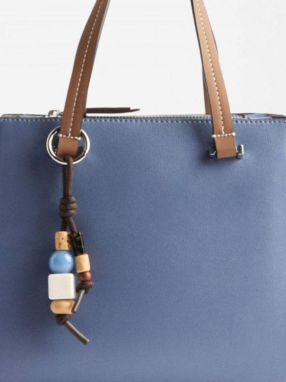 Bolsa tote color block en dos colores con colgante. Forro y bolsillo interior. Cierre magnético. Compartimentos laterales con cierre de cremallera. Asas de mano fijas. Asa bandolera ajustable y removible.