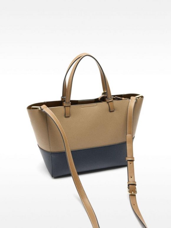 Bolso tote color block con textura. Forro y bolsillo interior. Compartimentos laterales con imán. Cierre de cremallera. Colgante extraíble. Asas de mano fijas. Asa de hombro ajustable y extraíble.
