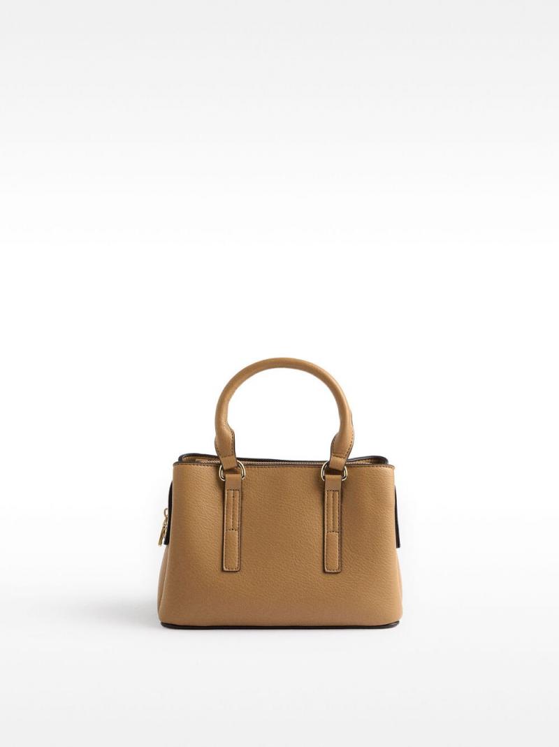 Mala tote pequeña con textura. Compartimento central con cierre de cremallera. Divisiones laterales con cierre magnético. Forro y bolsillo interior. Asas de mano fijas. Asa bandolera ajustable y removible.