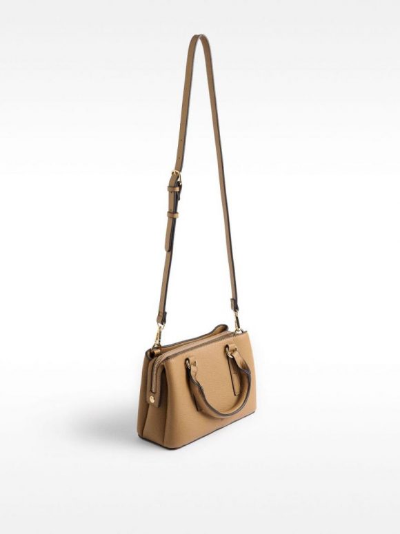 Mala tote pequeña con textura. Compartimento central con cierre de cremallera. Divisiones laterales con cierre magnético. Forro y bolsillo interior. Asas de mano fijas. Asa bandolera ajustable y removible.