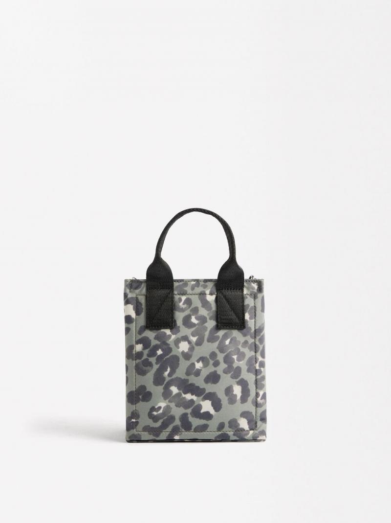 Bolso tote de nylon estampado de leopardo de forma rectangular. Tamaño pequeño. Forro y bolsillo interior. Cierre de cremallera. Asas de mano fijas. Asa bandolera ajustable y extraíble.