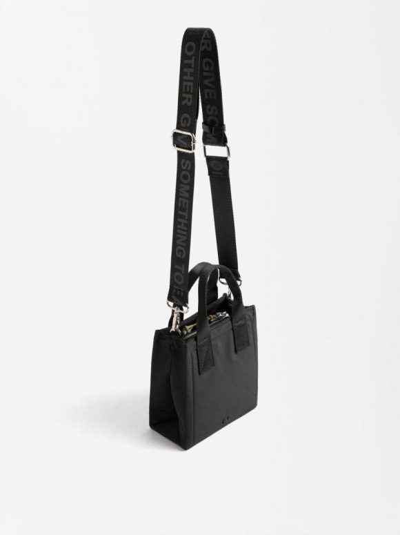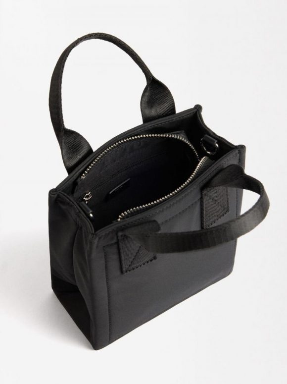 Bolso tote de nylon rectangular. Tamaño pequeño. Forro y bolsillo interior. Cierre de cremallera. Asas de mano fijas. Asa bandolera de hombro ajustable y extraíble.
