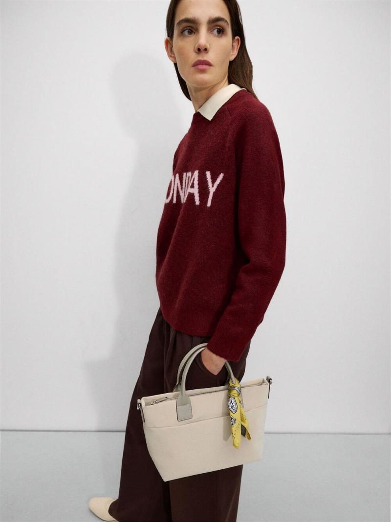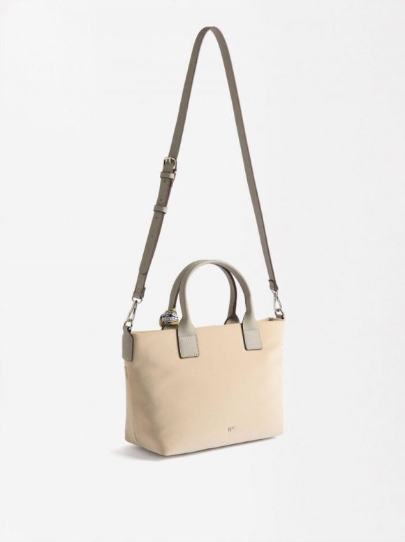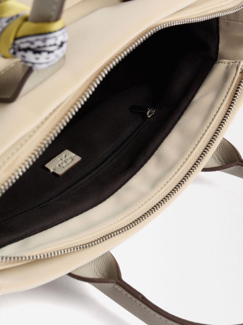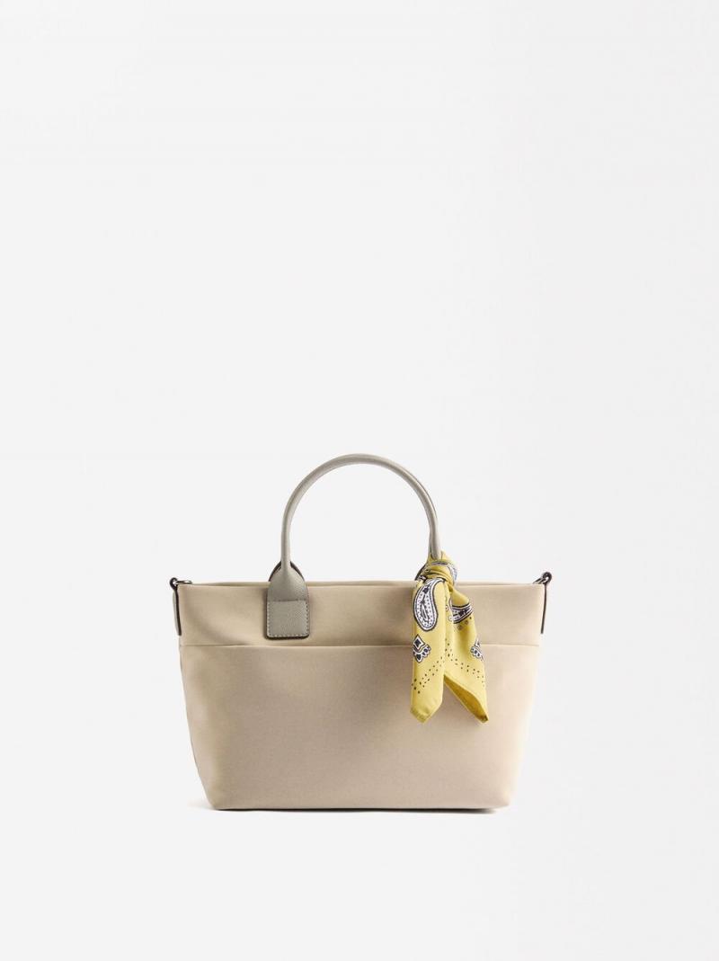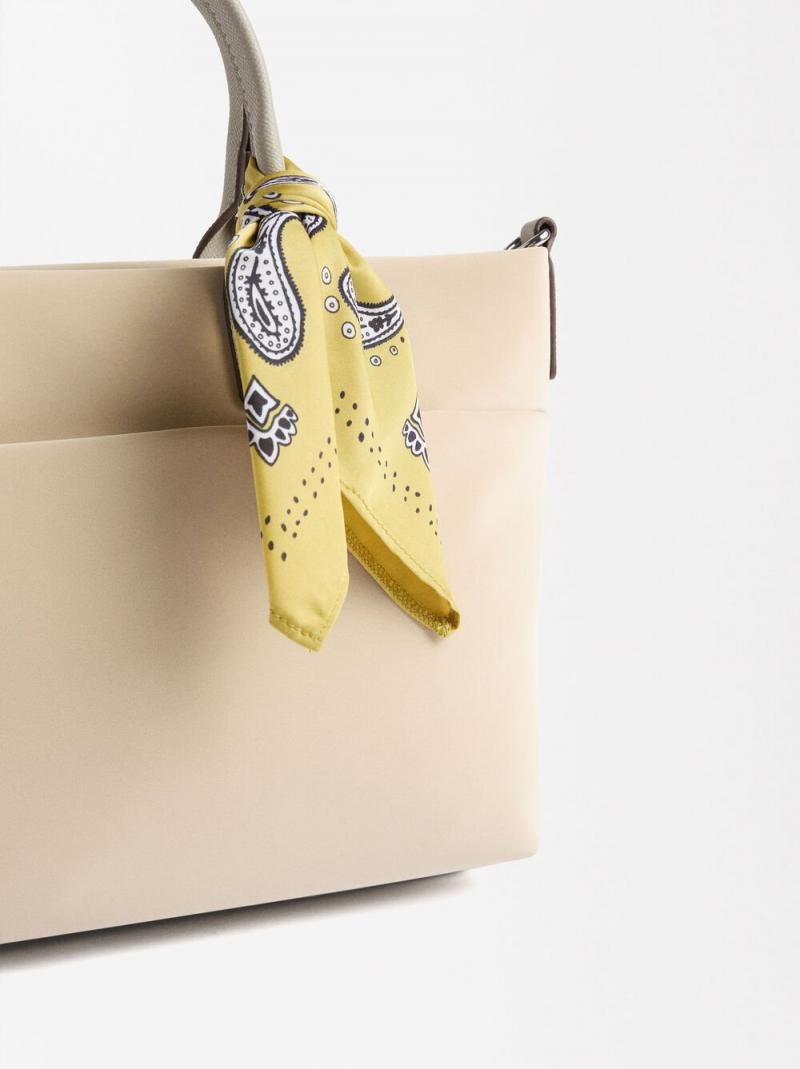 Bolso tote de tamaño mediano. Forro y bolsillo interior. Cierre de cremallera. Bolsillo exterior. Asas de mano fijas. Asa bandolera ajustable y removible. Detalle de pañuelo decorativo atado.