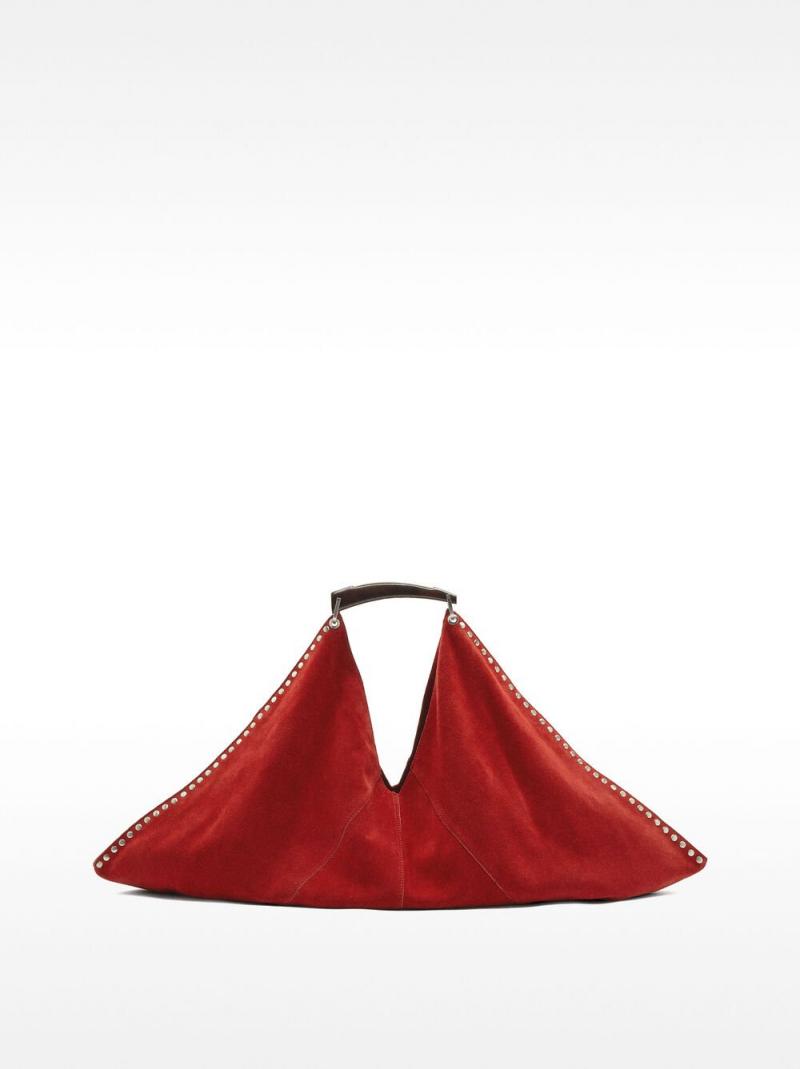 Bolso de hombro de piel de ante. Tachuelas en los bordes laterales. Forma geométrica. Pespuntes marcados. Asa rígida fija.