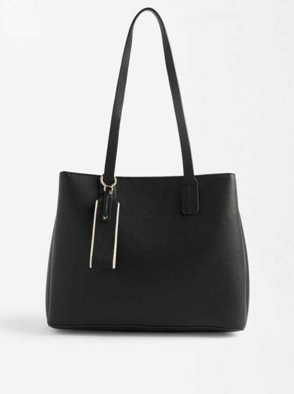 Bolso tote con textura y colgante. Asas de hombro fijas. División central con bolsillo y forro interior; cierre de cremallera. Compartimentos laterales con cierre magnético.