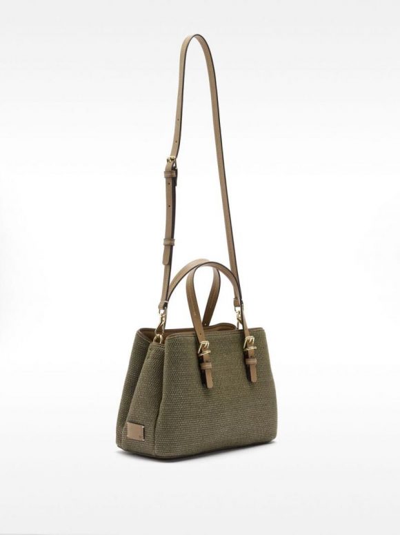Bolso tote con efecto rafia. Compartimento central con cierre de cremallera. Compartimentos laterales con cierre magnético. Forro y bolsillo interior. Asas de mano ajustables. Asa bandolera ajustable y removible.