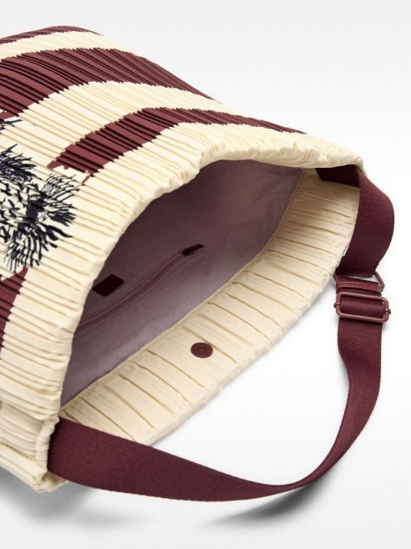 Bolso de hombro de nylon plisado a rayas. Detalle de flor estampada. Forro y bolsillo interior. Cierre con imán. Asa fija ajustable.