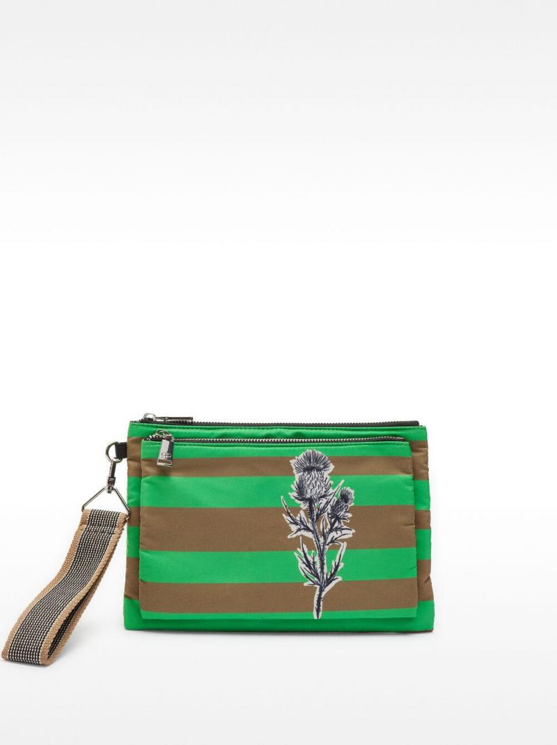 Bolsa multiusos doble a rayas con estampado de flores. Forro interior con ranuras para tarjetas. Cierre de cremallera. Asa de mano extraíble.