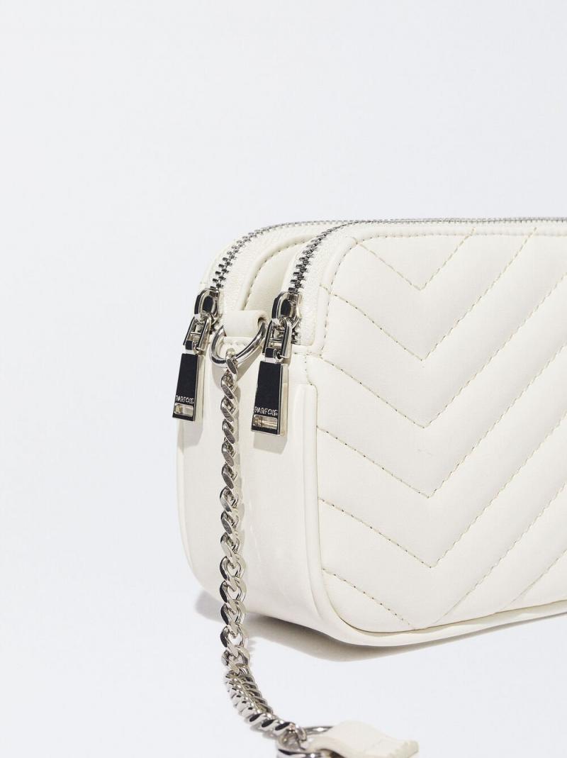 Bolso bandolera acolchado con asa de cadena combinada y ajustable. Dos compartimentos laterales con cremallera y uno central con cierre de imán.