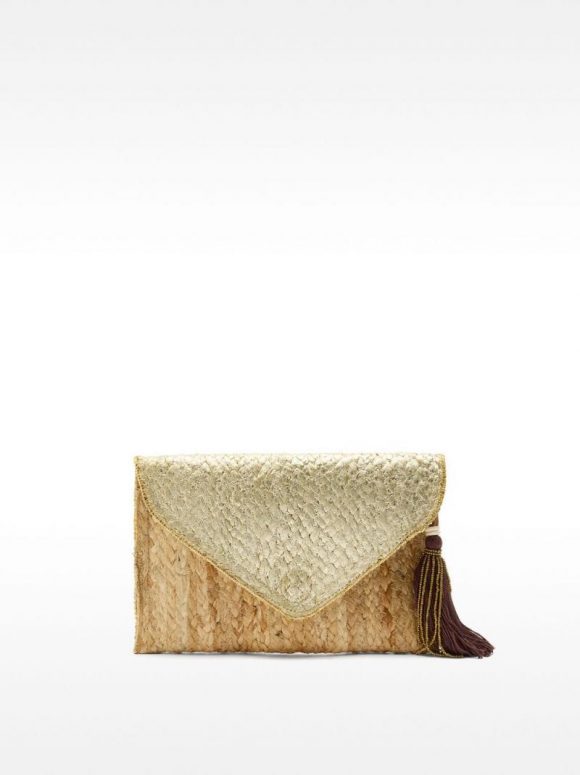 Bolso de fiesta de yute tipo sobre. Cierre de solapa metalizado imantado. Colgante de cuentas. Asa de cadena removible.