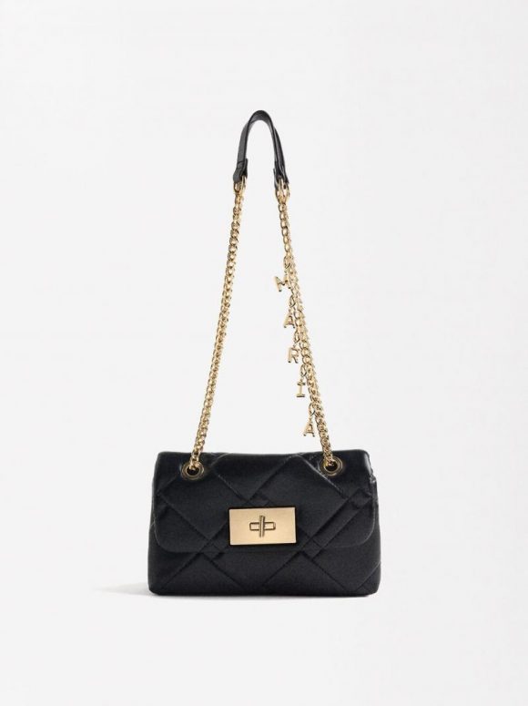 Bolso de hombro acolchado com asa de cadena. Cierre giratorio. Dos compartimentos. Forro y bolsillo interior. Puede ser personalizado con los charms de acero referencia 229377.