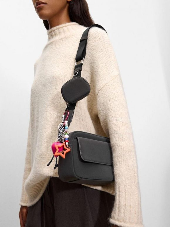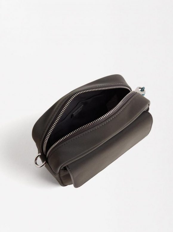 Bolso bandolera con textura aterciopelada. Bolsillo exterior con cierre de solapa con imán. Forro y bolsillo interior. Asa con colgante, ajustable y removible.