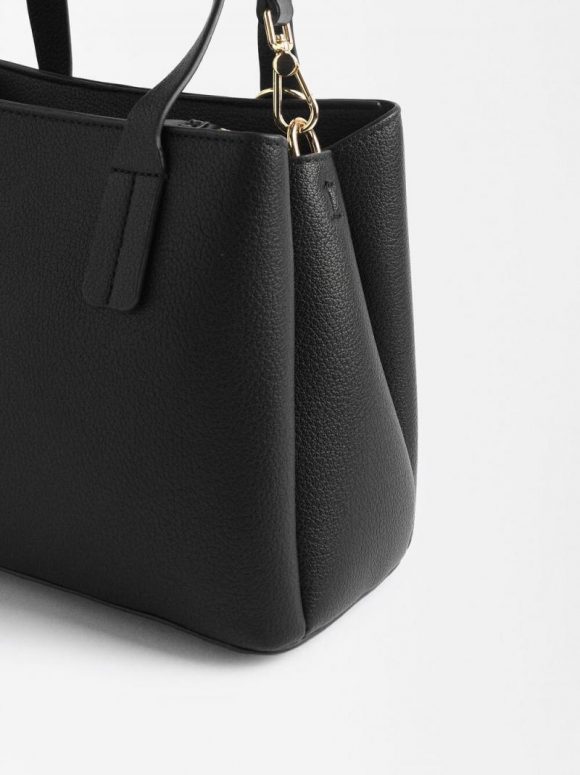 Bolsa tote con textura y colgante. Asas fijas. Asa bandolera ajustable y removible. División central con bolsillo y forro interior; cierre de cremallera. Compartimentos laterales con cierre magnético.