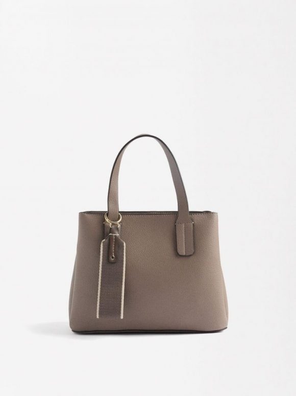 Bolsa tote con textura y colgante. Asas fijas. Asa bandolera ajustable y removible. División central con bolsillo y forro interior; cierre de cremallera. Compartimentos laterales con cierre magnético.