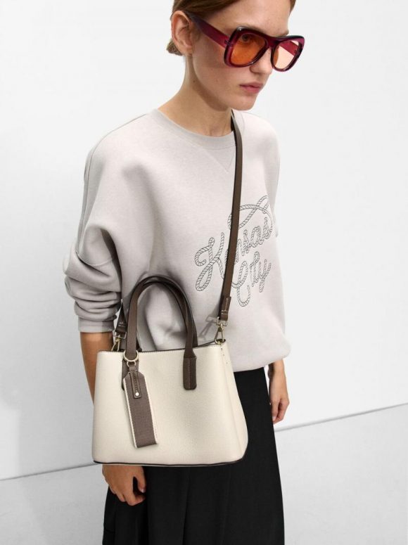Bolsa tote con textura y colgante. Asas fijas. Asa bandolera ajustable y removible. División central con bolsillo y forro interior; cierre de cremallera. Compartimentos laterales con cierre magnético.