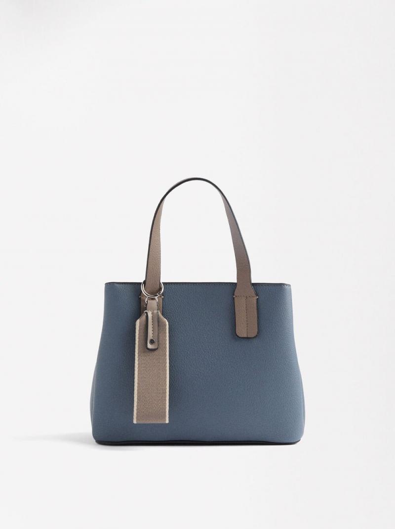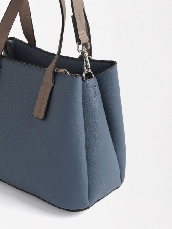 Bolsa tote con textura y colgante. Asas fijas. Asa bandolera ajustable y removible. División central con bolsillo y forro interior; cierre de cremallera. Compartimentos laterales con cierre magnético.