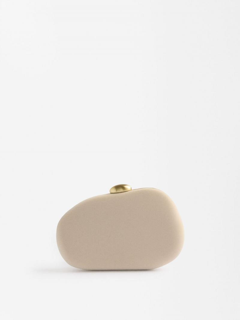 Clutch de fiesta ovalado con forro interior. Broche de cierre. Asa de cadena extraíble.