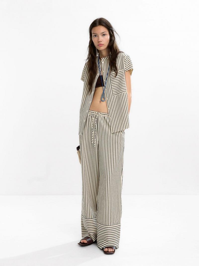 Camisa de rayas con manga corta. Cuello mao. Bolsillo lateral. Cierre de botones. La modelo mide 1,80 m y lleva una talla XS-S.