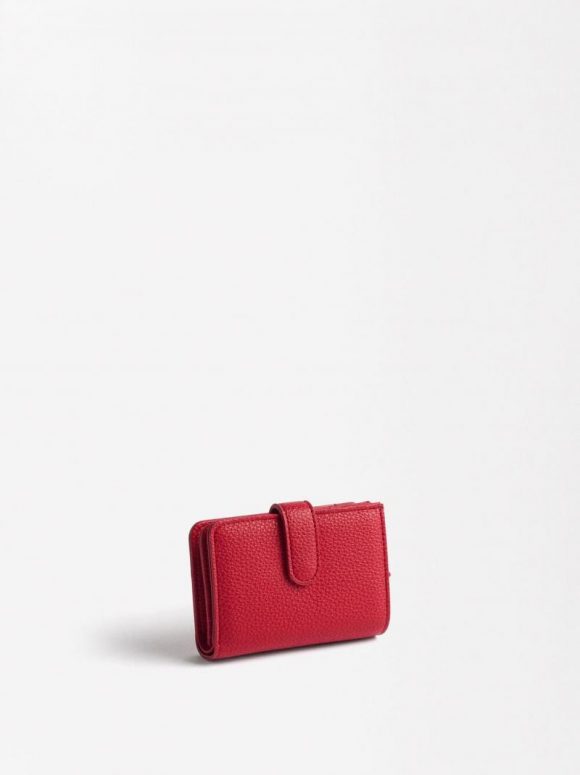 Cartera mediana con textura. División con ranuras para tarjetas y billetes, cierre con botón a presión. Compartimento con cierre de cremallera para monedas.