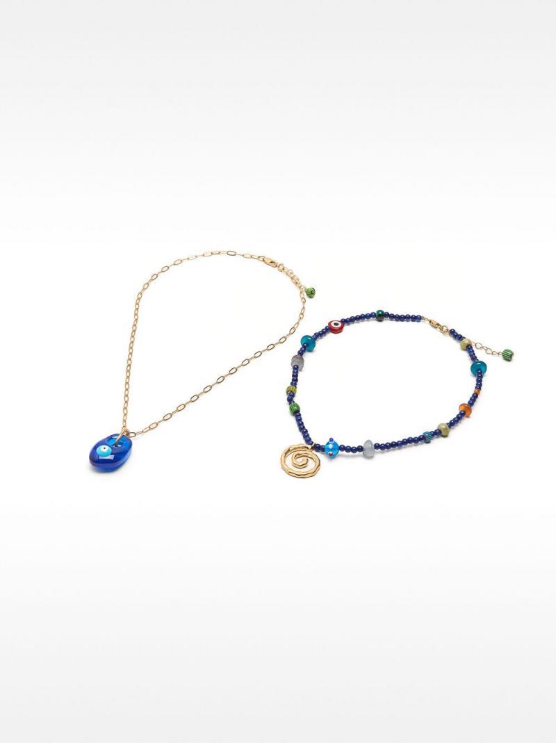 Conjunto de dos collares: uno con eslabones y colgante con detalle de ojo; otro con cuentas de resina y vidrio, colgante de espiral. Cierre de mosquetón. Acabado dorado.