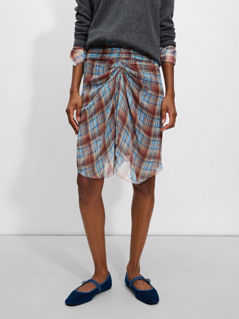 Falda estampada con fruncido en la parte delantera. Confeccionada en viscosa. Abertura en la parte posterior con cierre de cremallera.