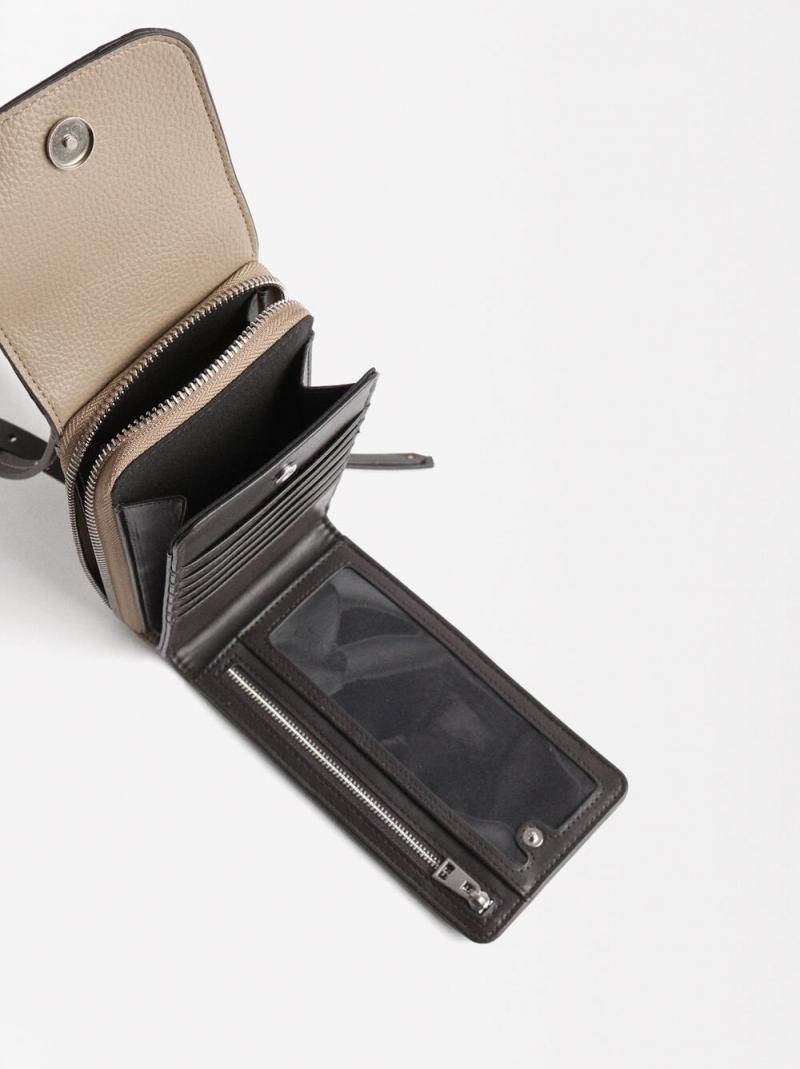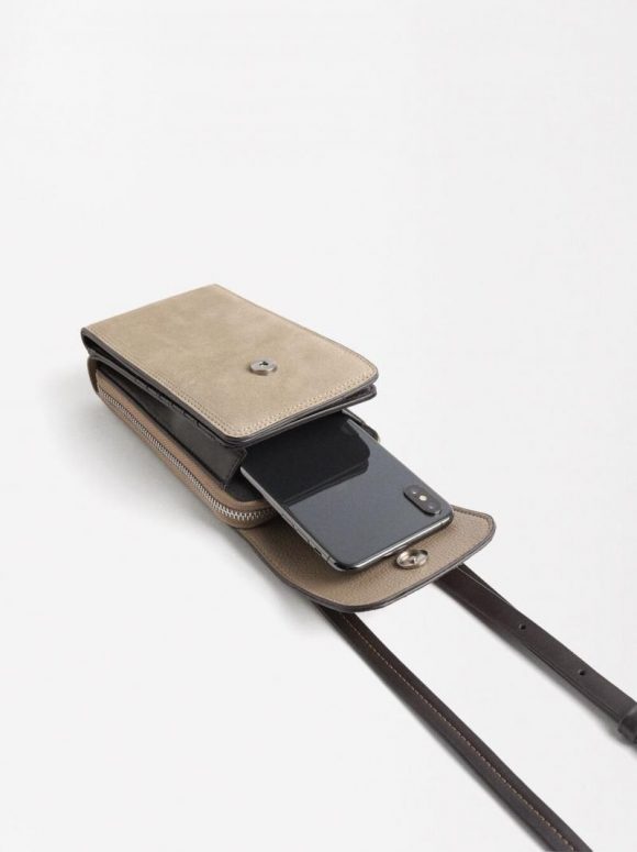 Bolso para móvil de piel con cierre de solapa imantado. Compartimento con ranuras para tarjetas. Asa bandolera fija y ajustable.