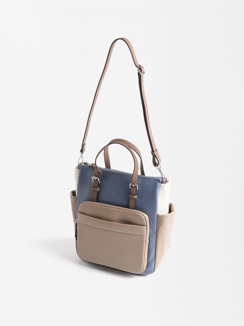 Mochila color block en tres colores. Asas multifunción ajustables y removibles: asas de mano; asa bandolera; asas posteriores. Forro y bolsillo interior. Bolsillos laterales. Bolsillo frontal y posterior con cierre de cremallera.