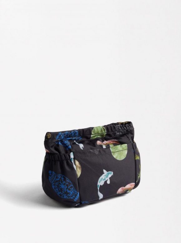 Bolsa de cosméticos estampada de nylon. Cierre de cremallera. Forro y bolsillo interior. Bolsillos exteriores.