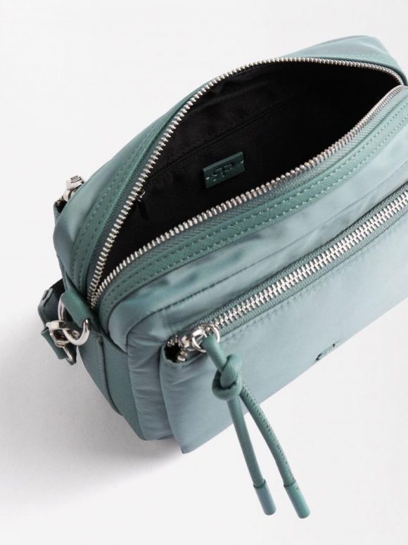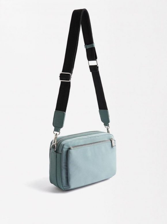 Bolsa cruzada de nylon. Forro y bolsillo interior. Bolsillos exteriores, frontal y posterior. Cierre de cremallera. Asa cruzada ajustable y removible.