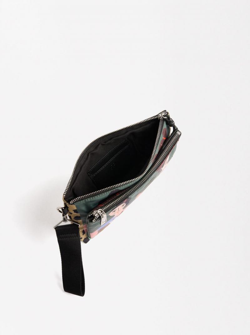 Bolso de mano doble de nylon estampado. Forro interior con ranuras para tarjetas. Cierre de cremallera. Asa de mano removible.