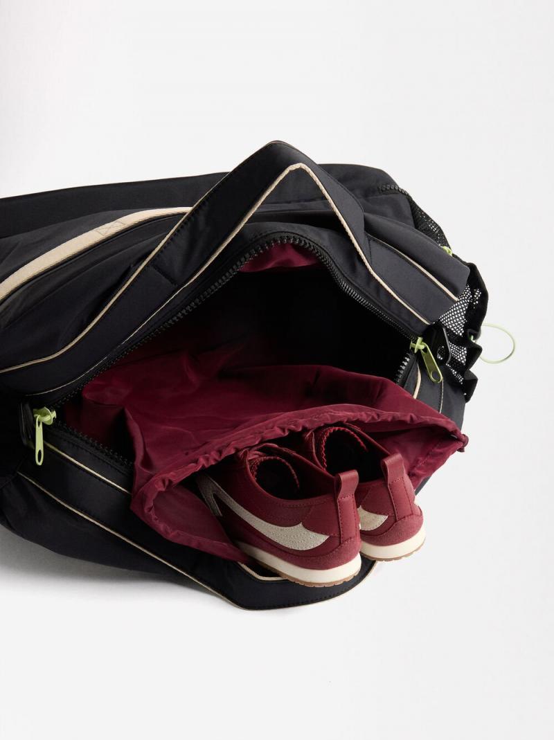 Bolso de viaje de nylon. Forro y bolsillo interior. Compartimento para calzado. Bolsillos exteriores. Cierre de cremallera. Asas de mano fijas. Asa bandolera ajustable y desmontable.