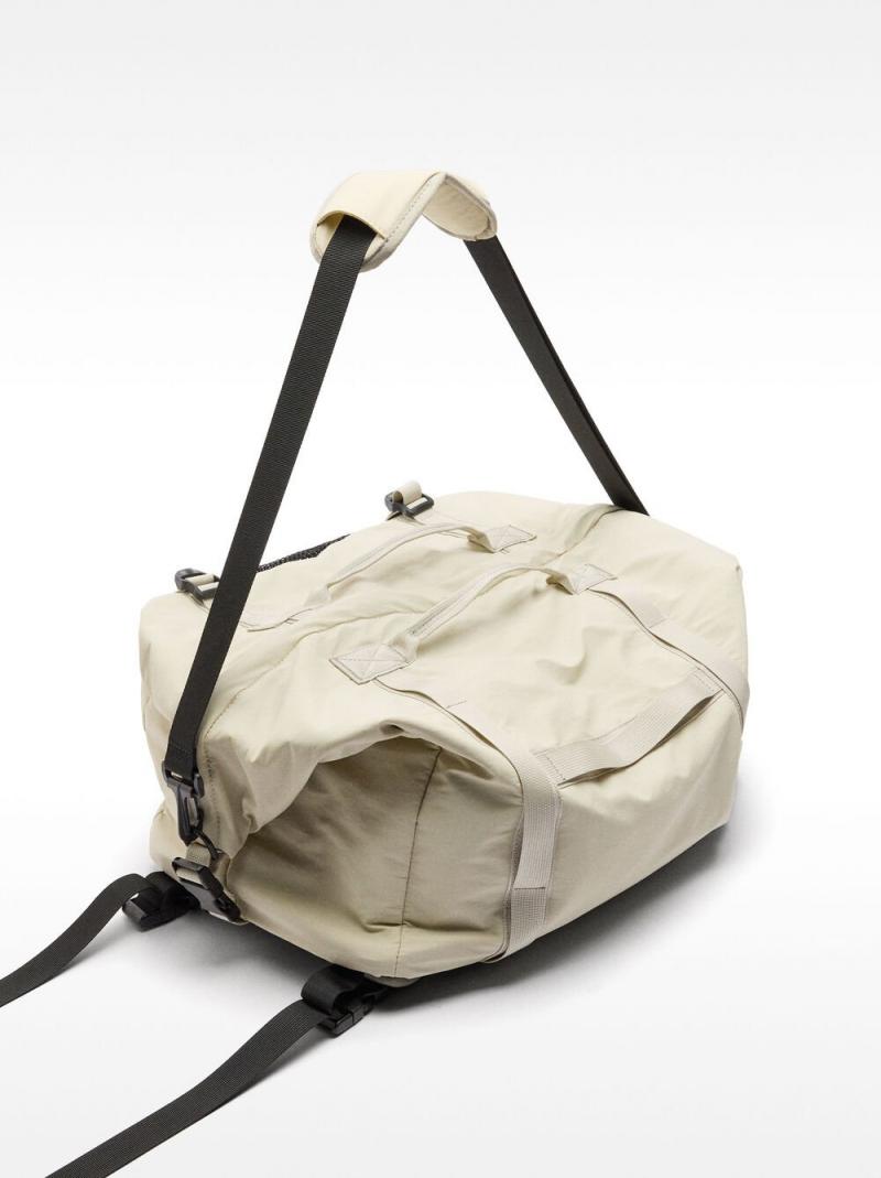 Bolso de viaje de nylon con estampado interior a rayas. Forro y bolsillo interior. Cierre de cremallera. Bolsillo exterior. Colgante extraíble. Asas de mano fijas. Asa bandolera ajustable y extraíble. Incluye una bolsa extraíble a rayas con colgante. Se puede convertir en mochila.
