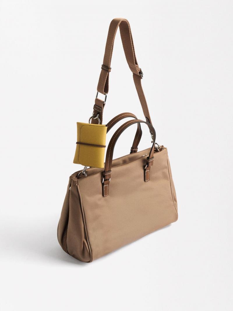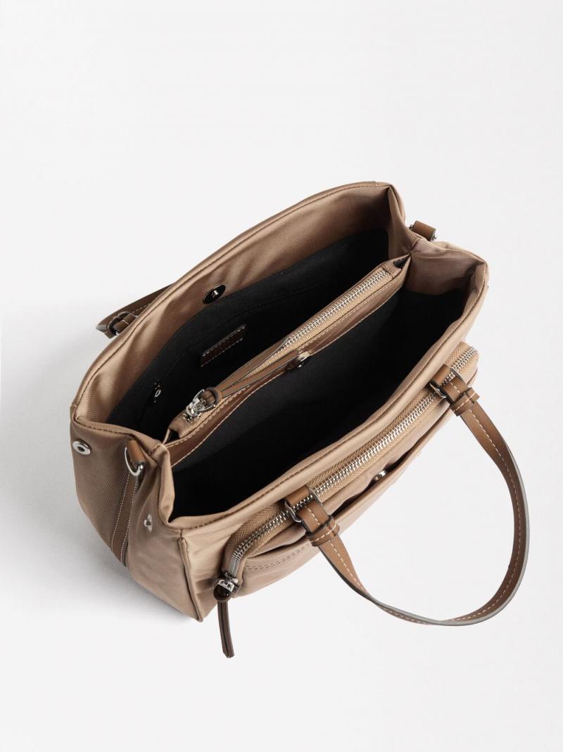Bolso tote grande de nylon. Compartimento central con cierre de cremallera. Divisiones laterales con forro y bolsillo interior. Bolsillo exterior con cierre de cremallera. Asas de mano fijas. Asa bandolera ajustable y desmontable.