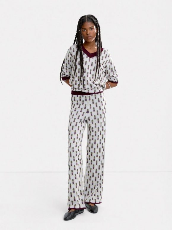 Pantalón de punto jacquard con diseño de rectángulos. Corte recto. Cintura elástica con detalle acanalado en color contrastante. Dobladillo en color contrastante. La modelo mide 1.75 m y lleva la talla XS-S.