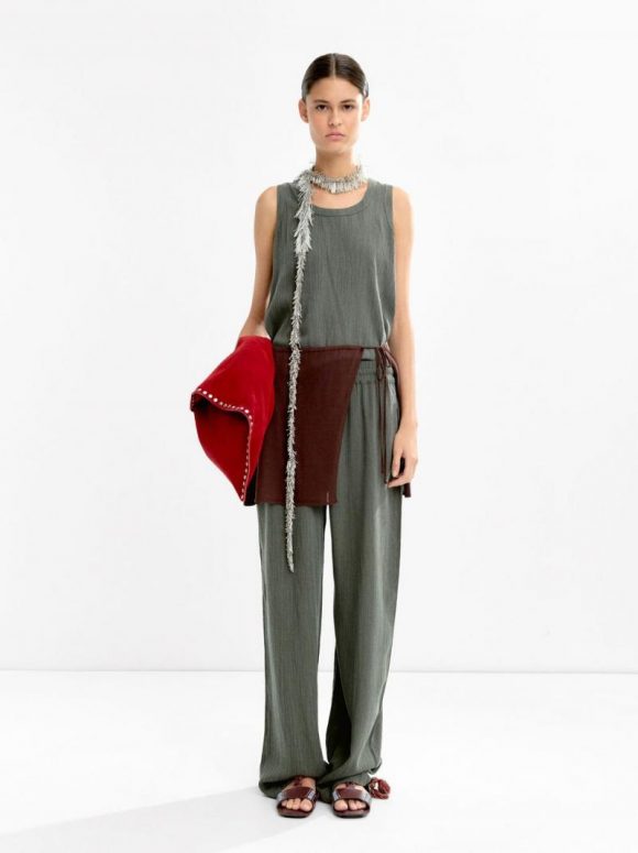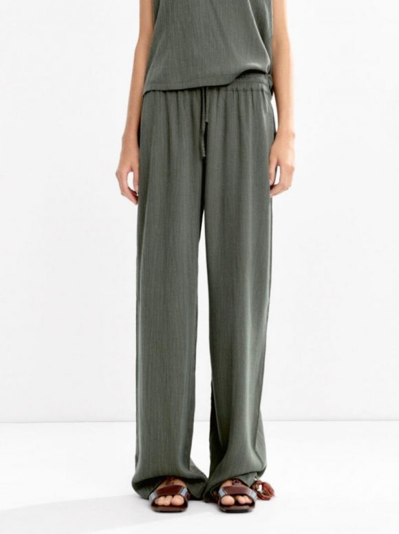 Pantalón fluido con efecto arrugado. Cintura elástica con cordón ajustable. Corte recto. La modelo mide 1.79 m y lleva la talla XS-S.
