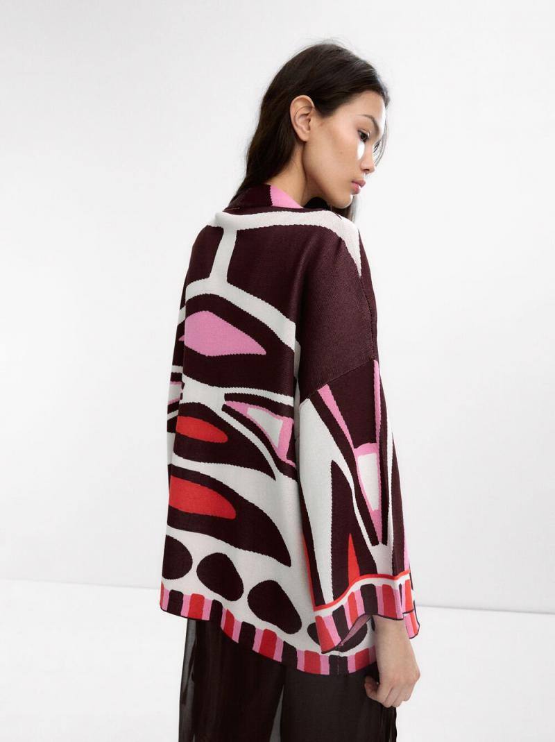 Quimono de punto en jacquard. Diseño geométrico en colores contrastantes. Manga larga. Este artículo de talla única está diseñado para crear una gran variedad de siluetas y adaptarse a diferentes tipos de cuerpo. La modelo mide 1,80 m