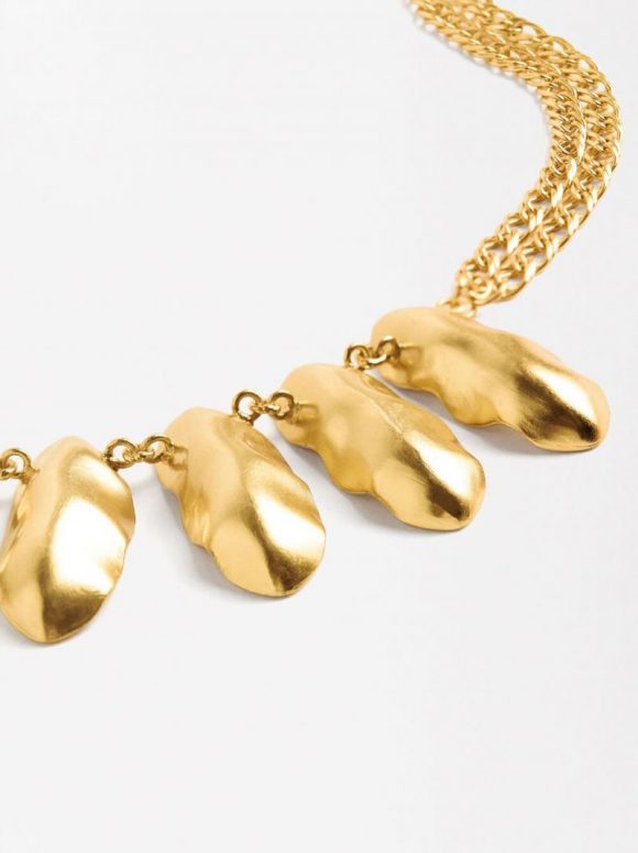 EXCLUSIVO ONLINE – Collar corto con pétalos irregulares y efecto cepillado. Acabado dorado con baño de oro de 18K.